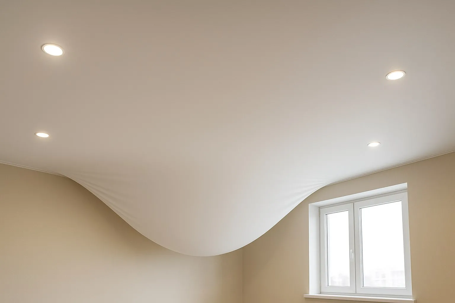 Как правило натяжной потолок отступает («съедает») всего лишь 4-5 сантиметра от нижней точки Вашего базового потолка.