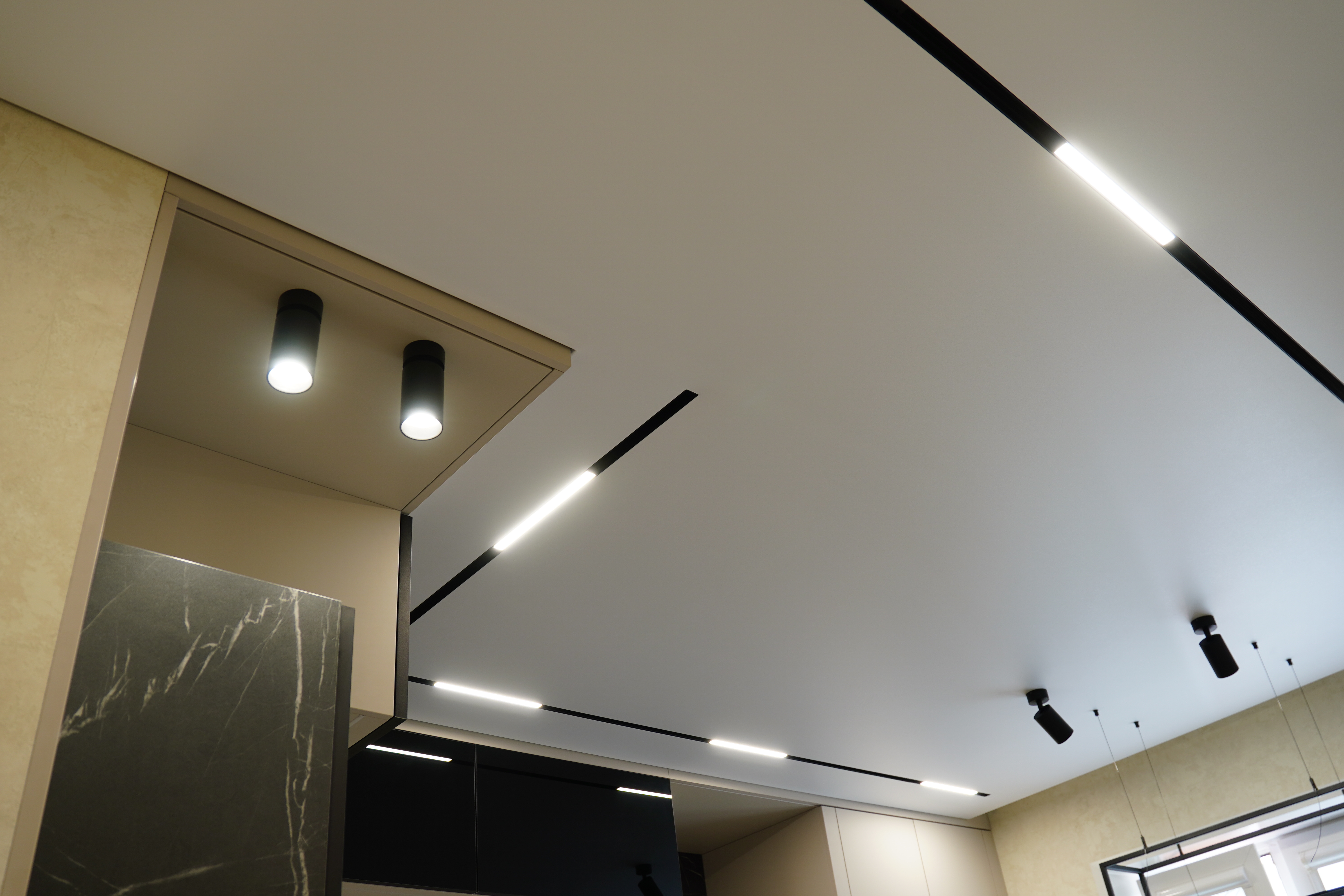 Эти покрытия подходят для одноуровневых и многоуровневых потолочных конструкций. Можно организовать контурную светодиодную подсветку, создать необычный эффект с помощью теневого профиля.