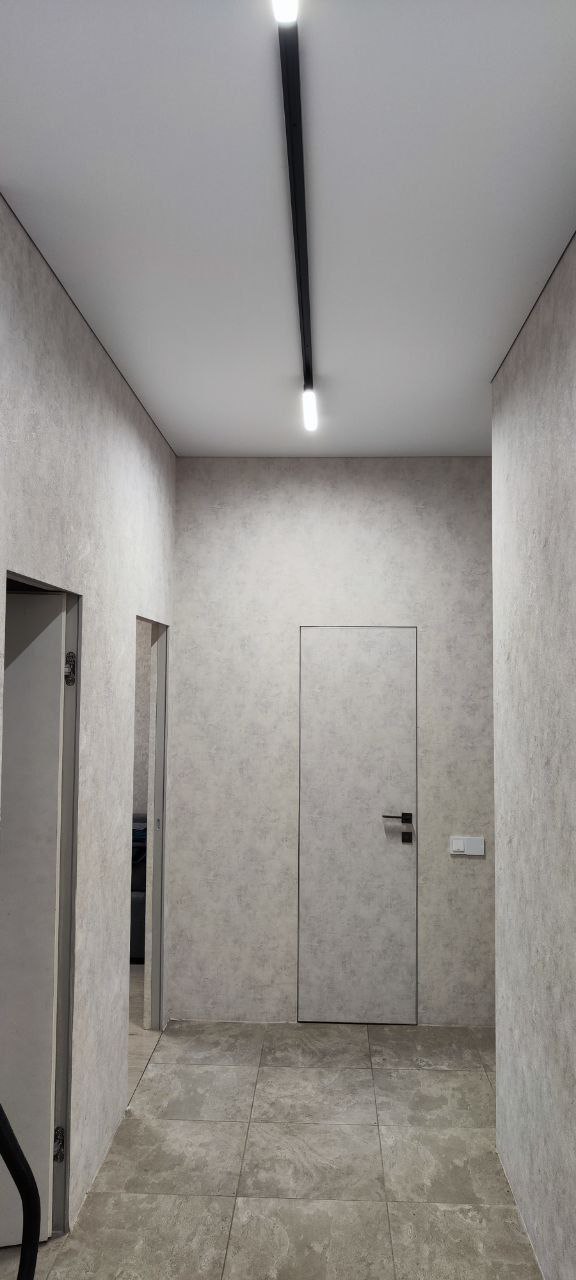 Белый матовый натяжной потолок Bauf с трековым освещением.
