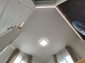 В квартире нужна была парящая конструкция с контурными потолками. «Седьмое небо» сделало все под ключ: от замера до установки. Учли особенности натяжного потолка, добавили подсветку по периметру. Комната преобразилась, световой потолок создает уют. Не жалеем о выборе!