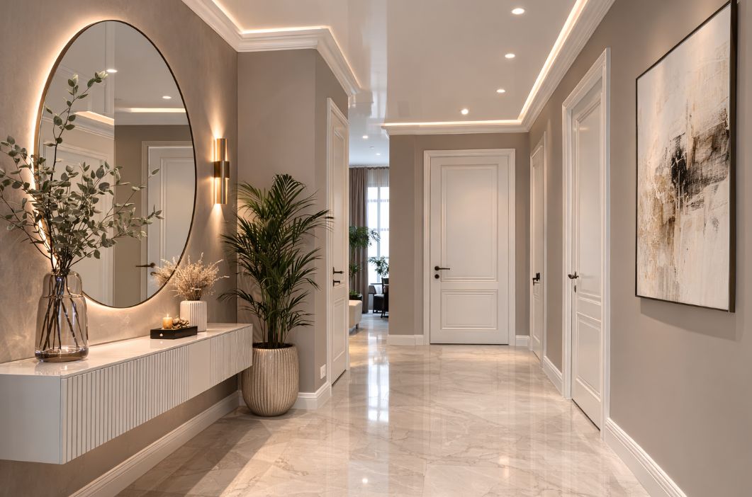 • Эстетическая функция: придаёт помещению завершённый вид, создаёт визуальную «рамку» по периметру потолка. В классических интерьерах используются плинтусы с лепниной, в современных — гладкие минималистичные варианты.